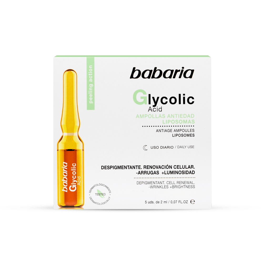 ویال (آمپول) ضد جوش و لایه بردار صورت باباریا babaria مدل گلیکولیک اسید Glycolic Acid حاوی 5 ویال 2 میل وگن و ساخت کشور اسپانیا میباشد.